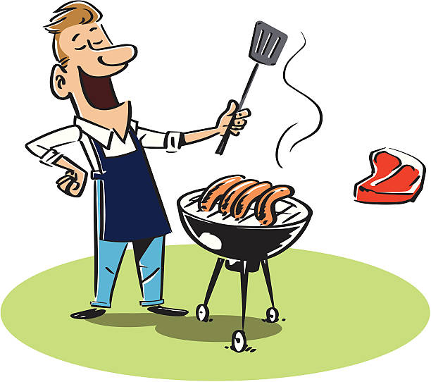 Next Image cookout Happy man with a barbecue wearing an apron. 1950s style illustration. The sausages can easily be replaced with the T-bone steak and the colored green circle can be removed.